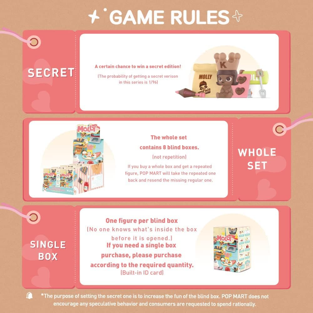 - POP MART MOLLY Cooking Series Prop Figures: Box toys are collectibles that come in a sealed box, with the content unknown to buyers until they open it. This collection contains 8 regular figures, and 1 hidden edition (Love Chocolate).
