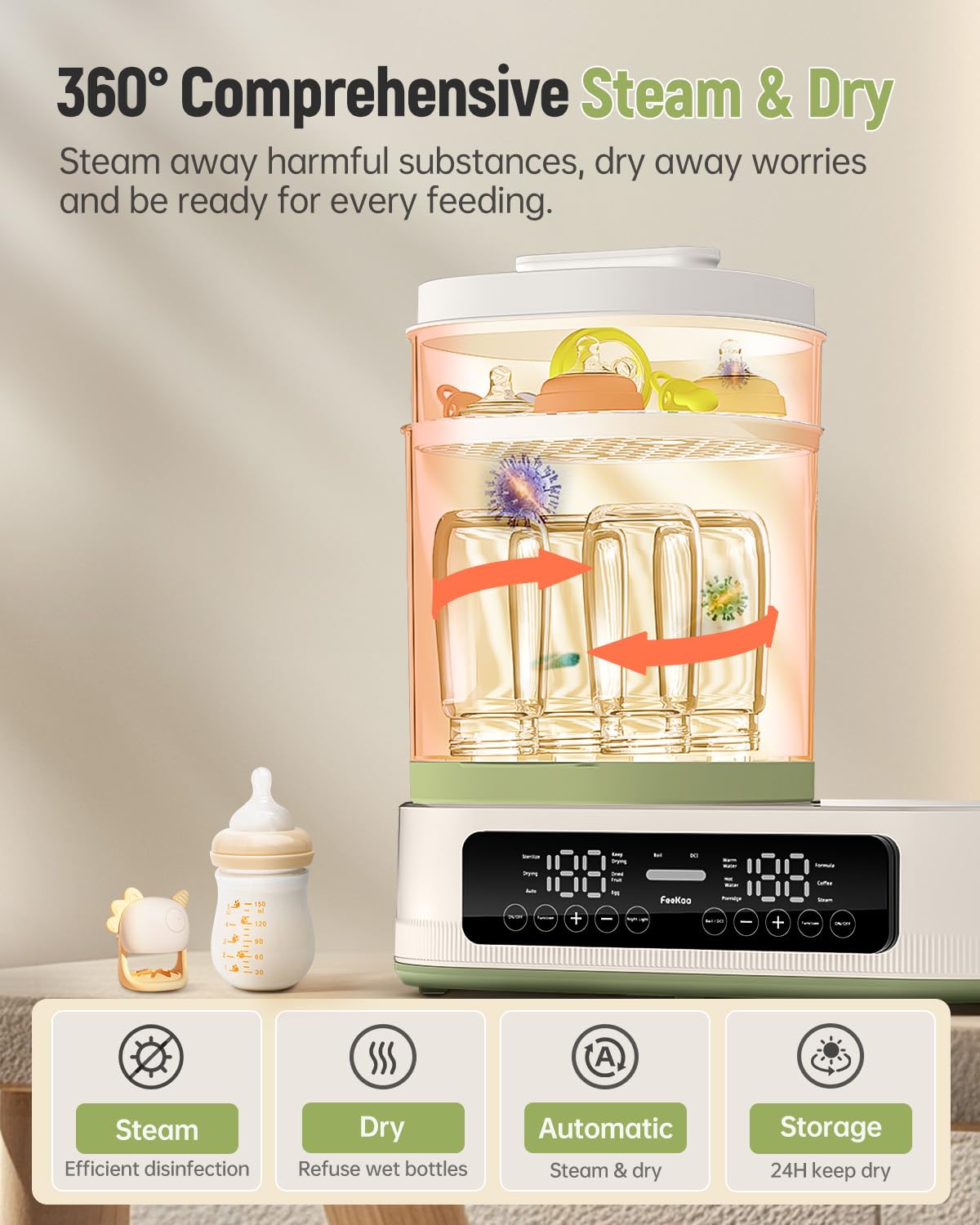 • 【Sterilize & Dry & Store 3-in-1】2 layer large-capacity baby bottle sterilizer and dryer, accommodates up to 4 baby bottles, pacifiers, teethers, plastic toys, pump parts & other accessories at once. With powerful steam to reduce 99.9% of harmful substances and hot air drying to prevent moisture buildup. It will stay in sterile storage for up to 24 hours after drying, without worrying about contamination, keeping your baby’s feeding essentials ready to use.