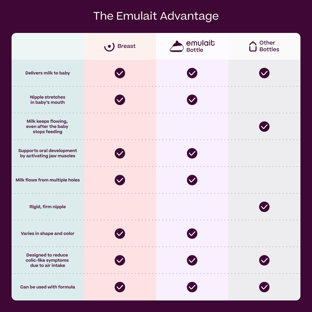 - Nurturing Breast-to-Bottle Transition: Designed to minimize nipple confusion and encourage prolonged breastfeeding, Emulait bottles offer a harmonious blend of comfort and oral development benefits. Say goodbye to preference issues as our biomimetic system ensures smooth transitions